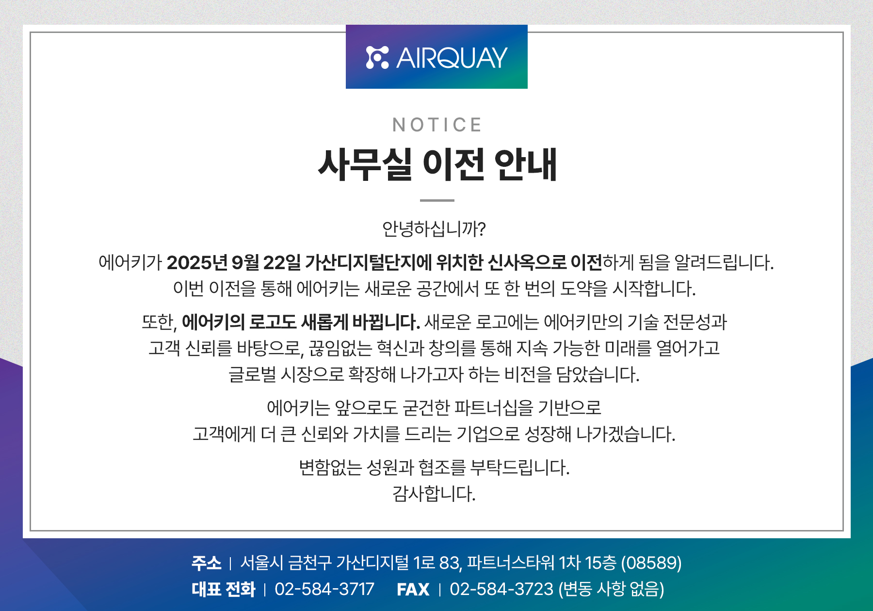 에어키그룹, 가산디지털단지 신사옥 이전 & 로고 교체에어키그룹이 9월 22일 가산디지털단지에 위치한 신사옥으로 이전하고, 또 한 번의 도약을 시작합니다.로고도 새롭게 바뀝니다. 에어키만의 기술 전문성과 고객 신뢰를 바탕으로, 지속 가능한 미래를 열어가겠다는 비전을 담고 있습니다. 새로운 터전에서 새로운 다짐으로 출발하는 에어키. 많은 관심과 성원 부탁드립니다.* 새로운 주소 : 서울시 금천구 가산디지털 1로 83, 파트너스타워 1차 15층 (08589)* 대표 전화 : 02-584-3717 (변동 사항 없음)